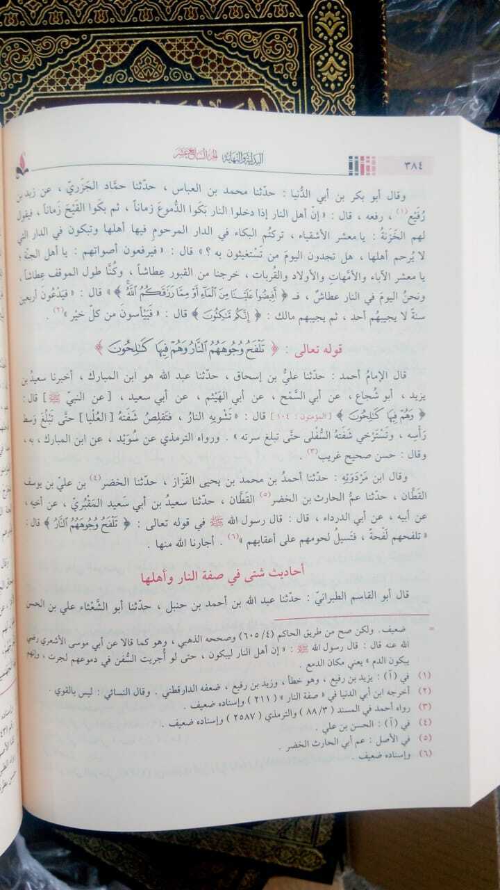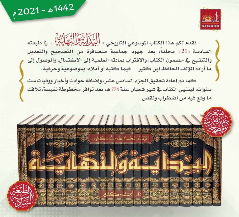 مصنف موسوعي مشهور، يشرح الأحداث التاريخية من مبدأ الخليقة حتى عصر المؤلف، وحظيت هذه الطبعة السادسة (21) مجلداً، بعد جهود جماعية متضافرة من التصحيح والتعديل والتنقيح في مضمون الكتاب، والاقتراب بمادته العلمية إلى الاكتمال، والوصول إلى ما أراده المؤلف الحافظ ابن كثير رحمه الله فيما كتبه أو أملاه، بموضوعية وحرفية. كما حظيت بالمقابلة على نسخ خطية موثوقة، وتفصيل النصوص وترقيمها، مع ضبط الأحاديث والآثار والبلدان وغير ذلك.