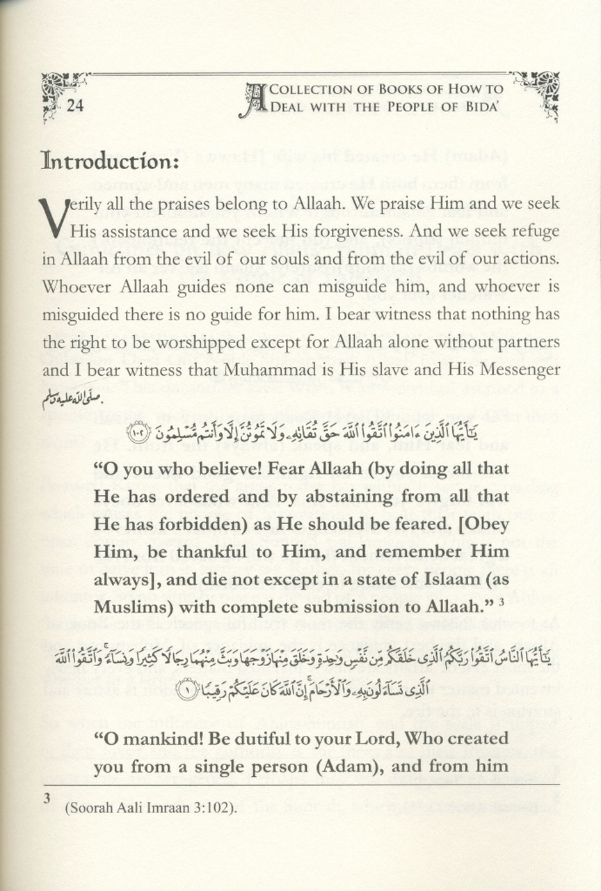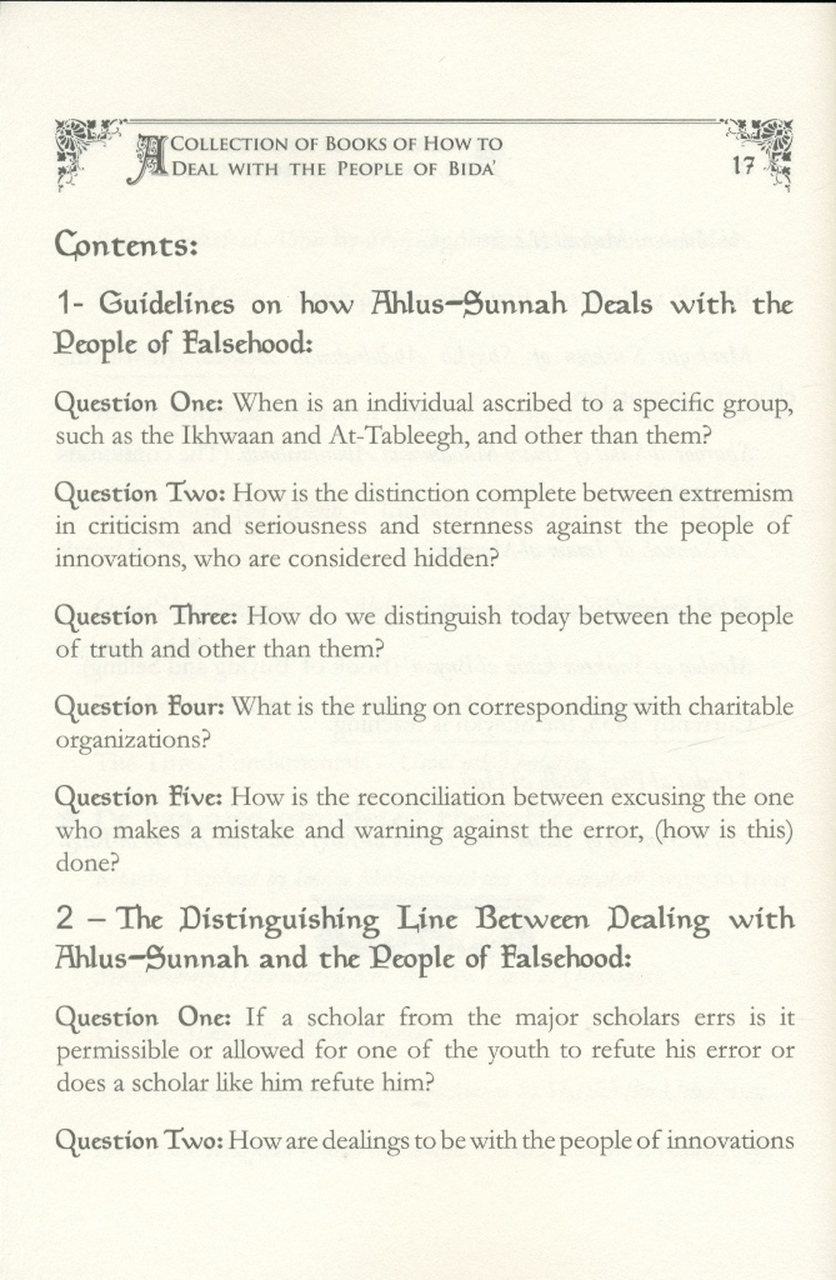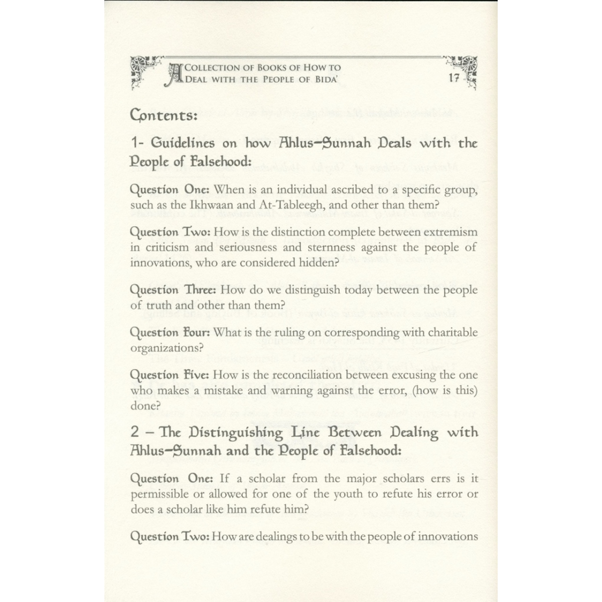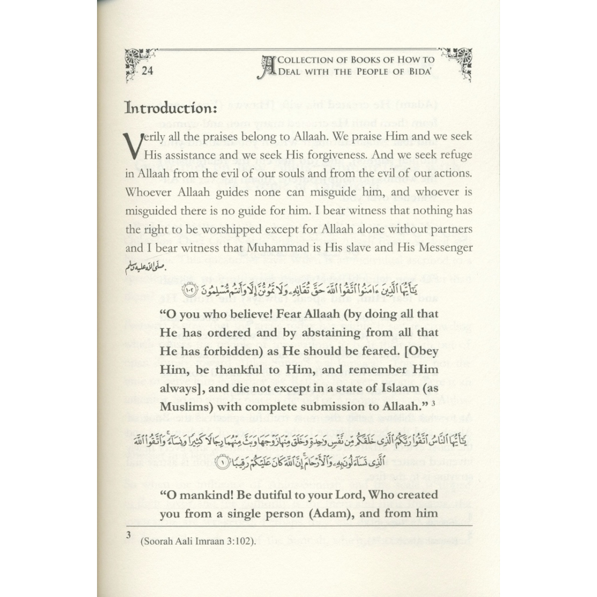 Innovations in the religion of Islam pollute the true Islam which is based upon the Qur’an, the authentic Sunnah and upon the understanding of the Salaf, therefore, we present before you an important collection of four treatises of detailed answers of how the People of sunnah deal with the people of Bidah.