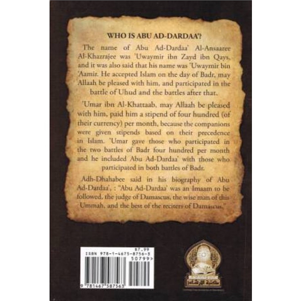 The name of Abu Ad-Dardaa Al-Ansaaree Al-Khazrajee was ’Uwaymir ibn Zayd ibn Qays, and it was also said that his name was ’Uwaymir bin ‘Aamir. He accepted Islam on the day of Badr, may Allaah be pleased with him, and participated in the battle of Uhud and the battles after that. ’Umar ibn Al-Khattaab, may Allaah be pleased with him, paid him a stipend of four hundred (of their currency) per month, because the companions were given stipends based on their precedence in Islam. ’Umar gave those who participated in the two battles of Badr four hundred per month and he included Abu Ad-Dardaa with those who participated in both battles of Badr. Adh-Dhahabee said in his biography of Abu Ad-Dardaa, “Abu Ad-Dardaa was an Imaam to be followed, the judge of Damascus, the wise man of this Ummah, and the best of the reciters of Damascus.