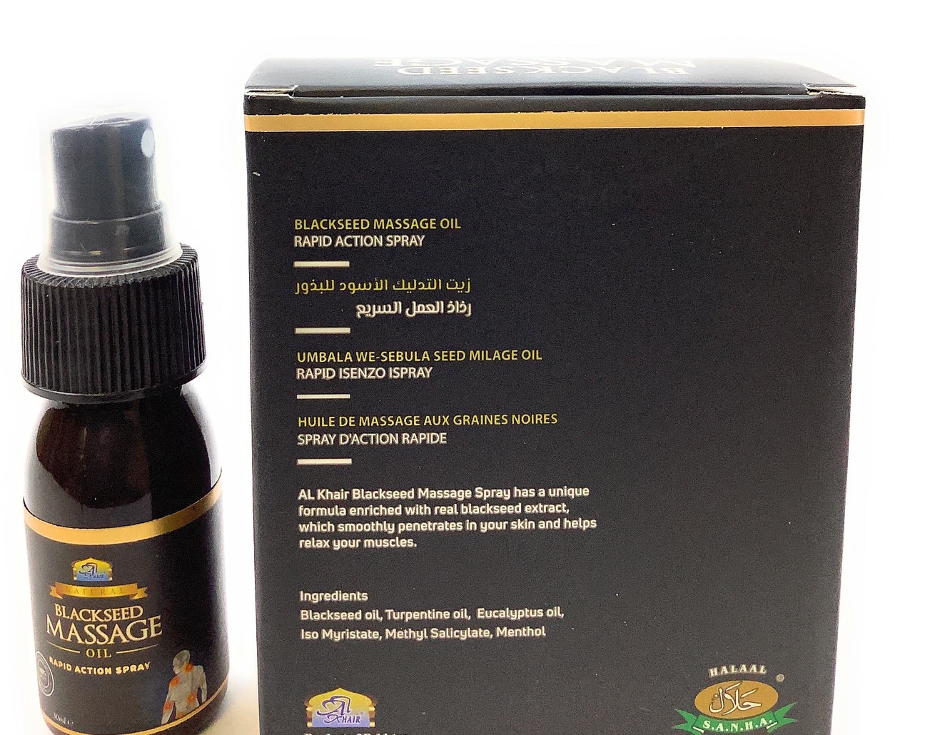 Al Khair Black Seed Massage Oil is a herbal massage oil made with Nigella sativa (black seed) and natural oils traditionally used for relaxation and skin care. Black seed oil contains natural antioxidant and anti-inflammatory compounds that help support healthy skin and muscle comfort.