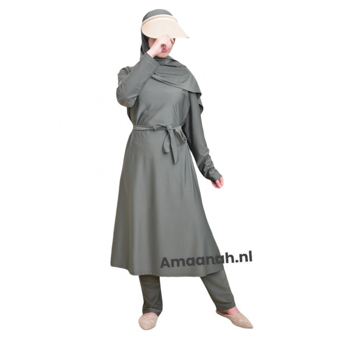 een lange tuniek met afneembare riem, legging, capuchon en een zwemsjaal die je kunt vastbinden. De sjaal kan als aanvulling of alleen gedragen worden. De tuniek heeft knopen om de capuchon vast te houden en strikbanden om de legging vast te houden, zodat de tuniek niet in het water omhoog kruipt.
