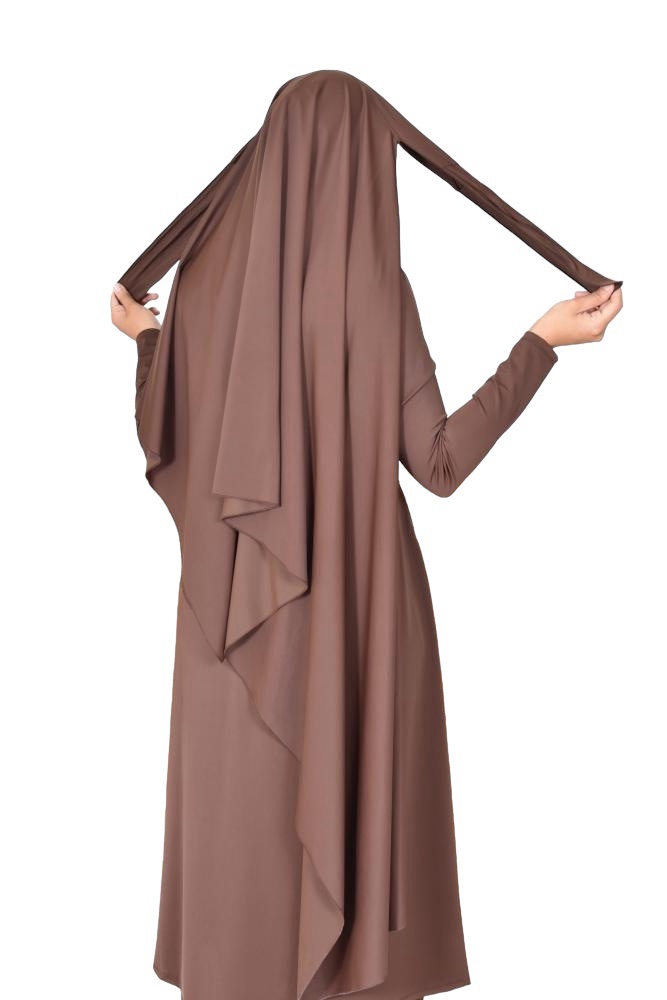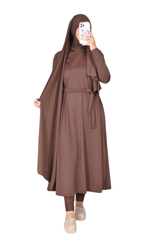 een lange tuniek met afneembare riem, legging, capuchon en een zwemsjaal die je kunt vastbinden. De sjaal kan als aanvulling of alleen gedragen worden. De tuniek heeft knopen om de capuchon vast te houden en strikbanden om de legging vast te houden, zodat de tuniek niet in het water omhoog kruipt.