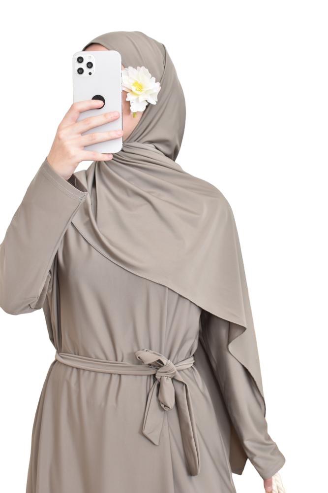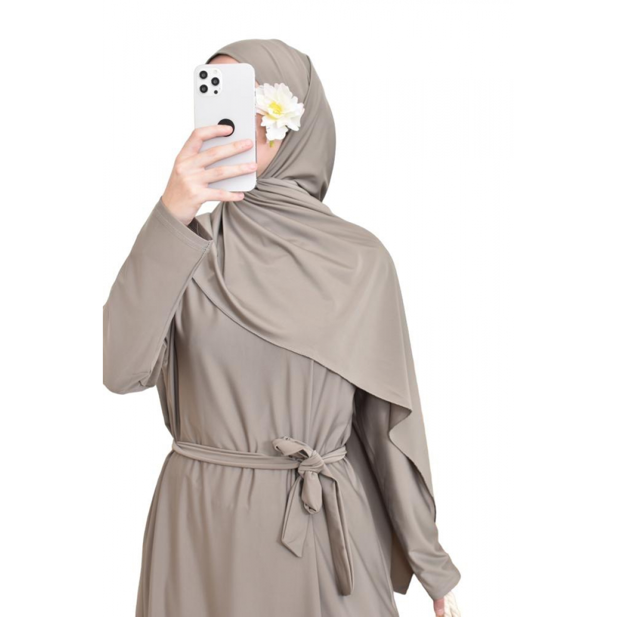 een lange tuniek met afneembare riem, legging, capuchon en een zwemsjaal die je kunt vastbinden. De sjaal kan als aanvulling of alleen gedragen worden. De tuniek heeft knopen om de capuchon vast te houden en strikbanden om de legging vast te houden, zodat de tuniek niet in het water omhoog kruipt.