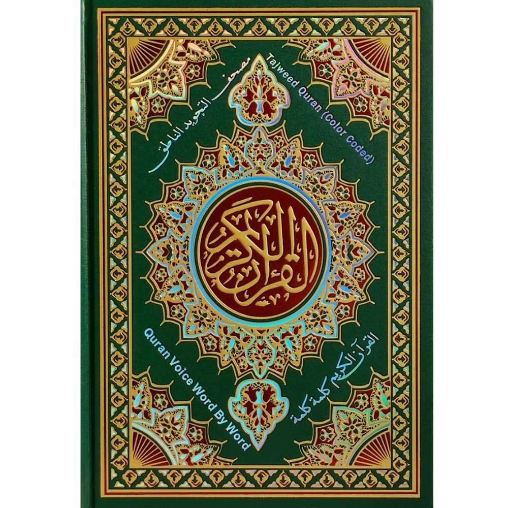 12 Reciters: Khaleel al Hosary, Abdullah Basfar, Abu Bakr Shatri, Abdur Rahman Sudais, Abdul Basit, Mahir al Muaqyli, Ahmed al Ajmy, Saad Ghamdi, Mohammed Minshavi, Mishary al Efasy, Minshavi with Children Reciting, Word by Word voice.