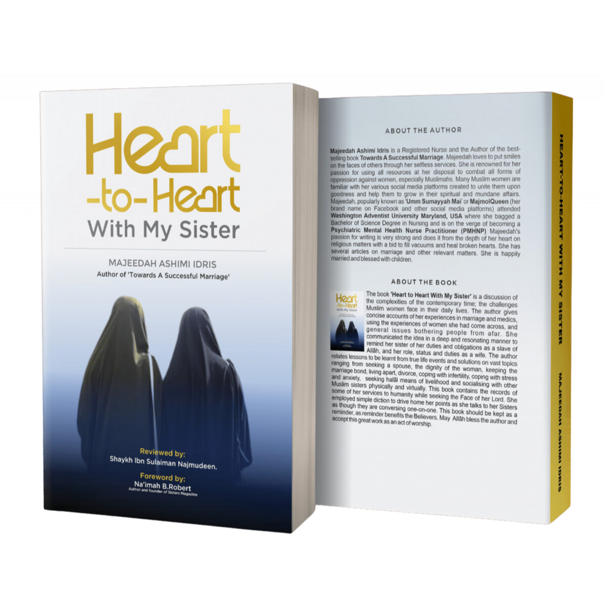 The book Heart-to-Heart with My Sister’ is a discussion of the complexities of the contemporary time; the challenges Muslim women face in their daily lives. The author gives concise accounts of her experiences in marriage and medics, using the experiences of women she had come across, and general issues bothering people from afar. She communicated the idea in a deep and resonating manner to remind her sister of her duties and obligations as a slave of Allāh, and her role, status and duties as a wife. The author relates lessons to be learnt from true life events and solutions on vast topics ranging from seeking a spouse, the dignity of the woman, keeping the marriage bond, living apart, divorce, coping with infertility, coping with stress and anxiety, seeking halāl means of livelihood and socialising with other Muslim sisters physically and virtually. This book contains the records of some of her services to humanity while seeking the Face of her Lord. She employed simple diction to drive home her points as she talks to her Sisters as though they are conversing one-on-one. This book should be kept as a reminder, as reminder benefits the Believers. May Allāh bless the author and accept this great work as an act of worship.