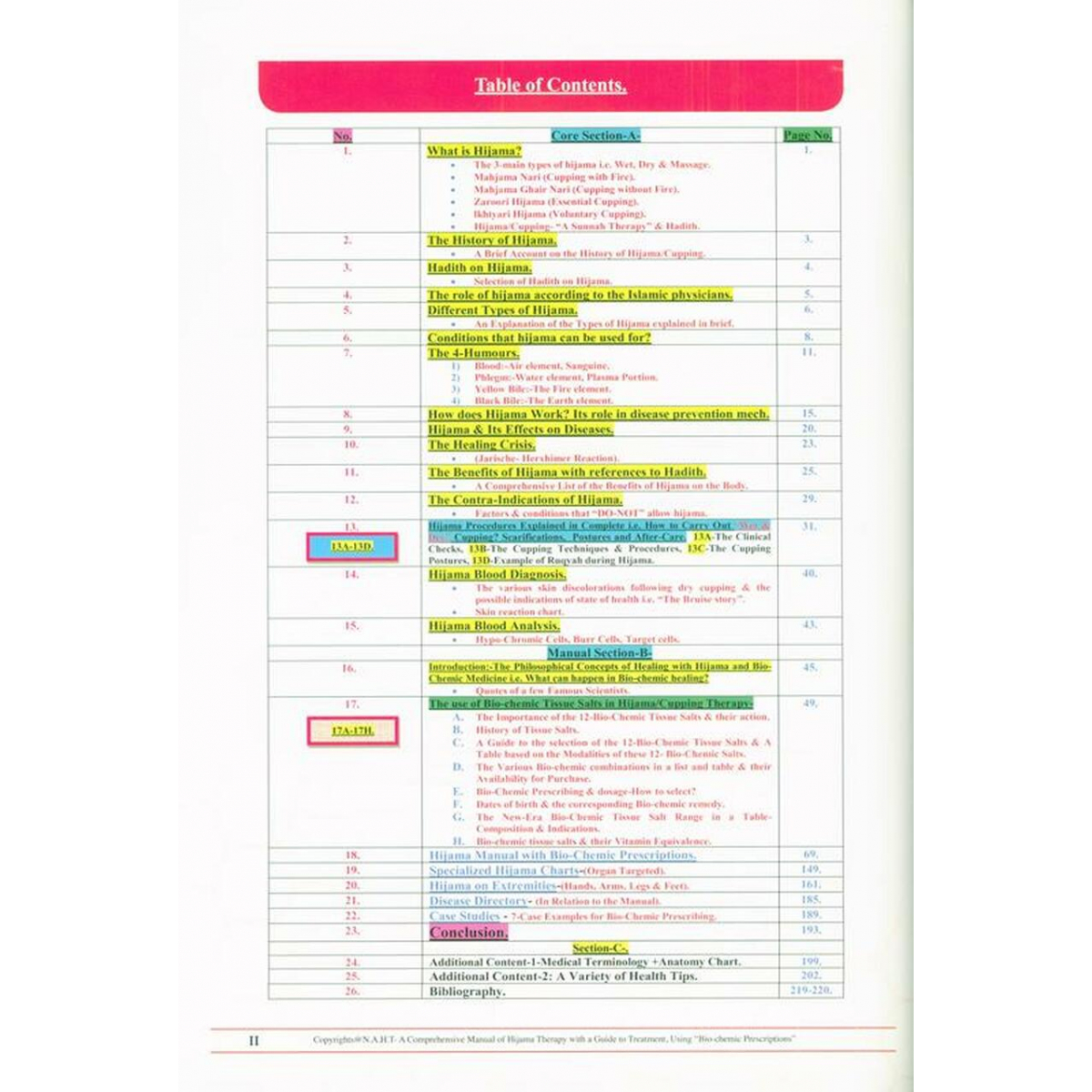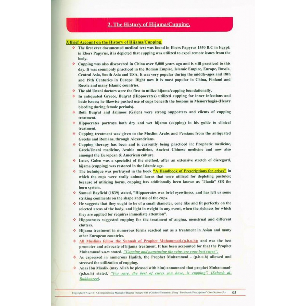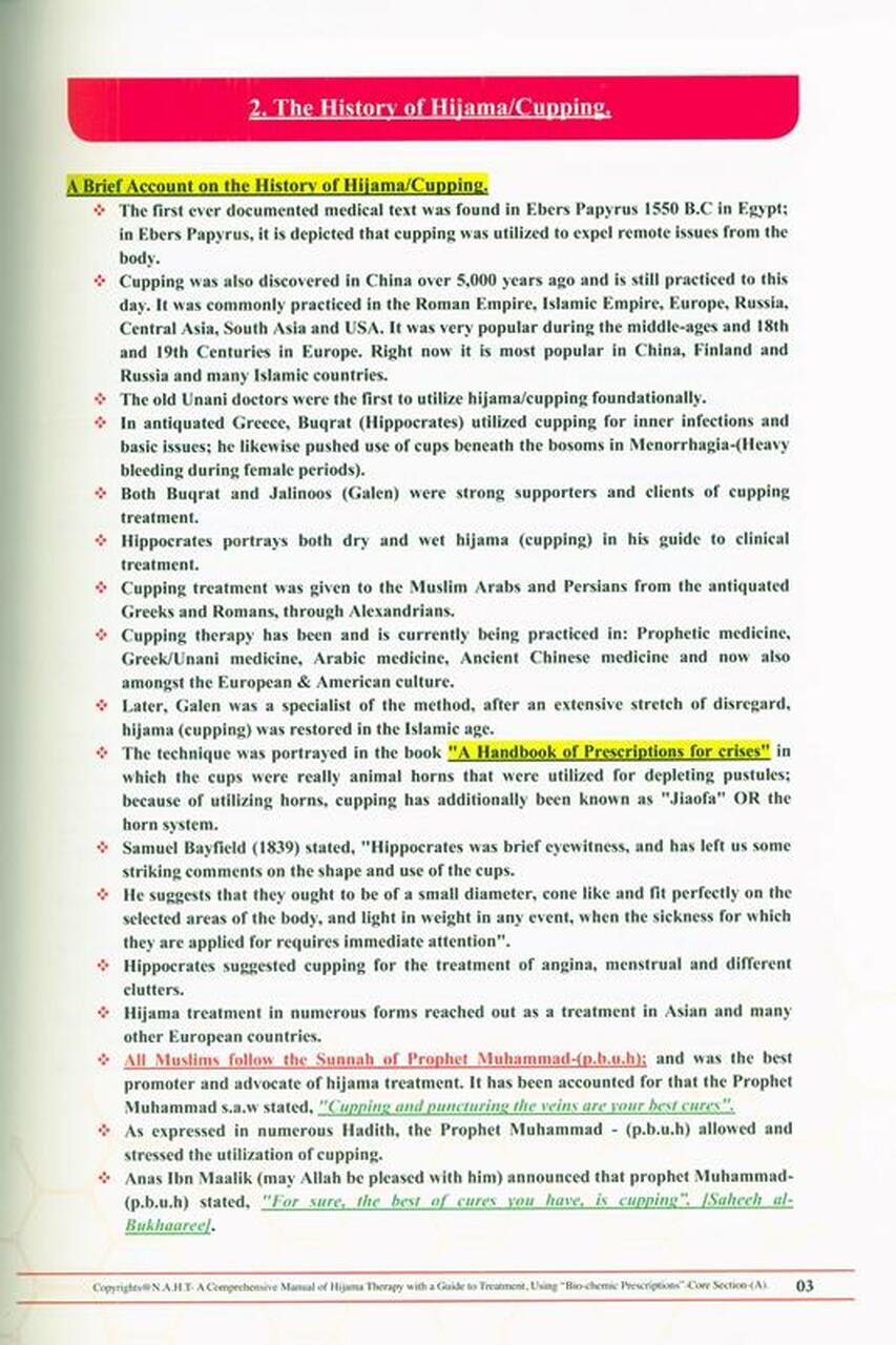 In addition to this, an excellent manual of Hijama on extremities has been prepared, which gives guidance to a newer approach in carrying out Hijama/cupping with excellent results. In addition to the main scope of this work, much further supplementary material has been added in the 2-separate additional information sections of this book, such as Medical vocabulary, Verses from the Quran for healing and healthy tips for, self-benefit OR for patient advice following Hijama treatment.