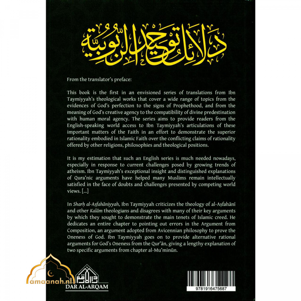 This book is the first in an envisioned series of translations from 1bn Taymiyyah’s theological works that cover a wide range of topics from the evidences of God’s perfection to the signs of Prophethood, and from the meaning of God’s creative agency to the compatibility of divine predestination with human moral agency. The series aims to provide readers from the English-speaking world access to Ibn Taymiyyah’s articulations of these important matters of the Faith in an effort to demonstrate the superior rationality embodied in Islamic Faith over the conflicting claims of rationality offered by other religions, philosophies and theological positions. It is my estimation that such an English series is much needed nowadays, especially in response to current challenges posed by growing trends of atheism.Ibn Taymiyyah’s exceptional insight and distinguished explanations of Qura’nic arguments have helped many Muslims remain intellectually satisfied in the face of doubts and challenges presented by competing world views.[…] In Sharh al-Asfahāniyyah,Ibn Taymiyyah criticizes the theology of al-Asfahāni and other Kalam theologians and disagrees with many of their key arguments by which they sought to demonstrate the main tenets of Islamic creed. He dedicates an entire chapter to pointing out errors in the Argument from Composition, an argument adopted from Avicennian philosophy to prove the Oneness of God. Ibn Taymiyyah goes on to provide alternative rational arguments for God’s Oneness from the Qur’ān, giving a lengthy explanation of two specific arguments from chapter al-Mu’minūn.