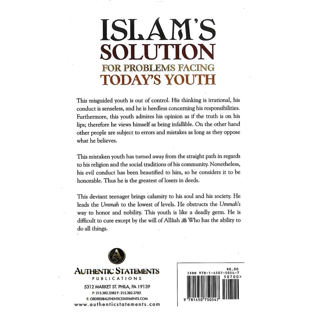 This misguided youth is out of control. His thinking is irrational, his conduct is senseless, and he is heedless concerning his responsibilities. Furthermore, this youth admires his opinion as if the truth is on his lips, therefore he views himself as being infallible on the other hand other people are subject to errors and mistakes as long as they oppose what he believes. This mistaken youth has turned away from the straight path in regards to his religion and the social traditions of his community.