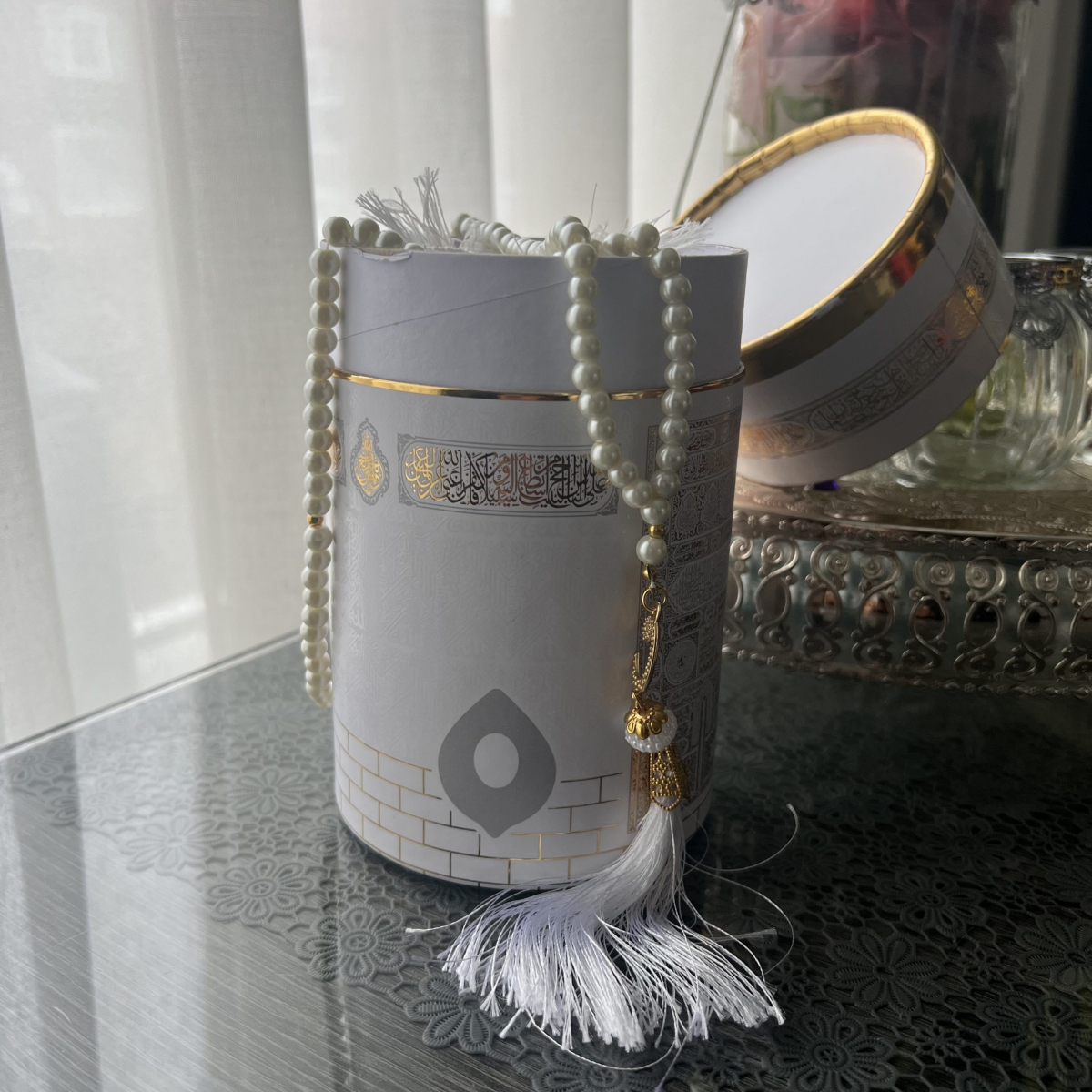 Prayer Rug & Rosary Set Kaaba in an elegant cube Kabah box – White