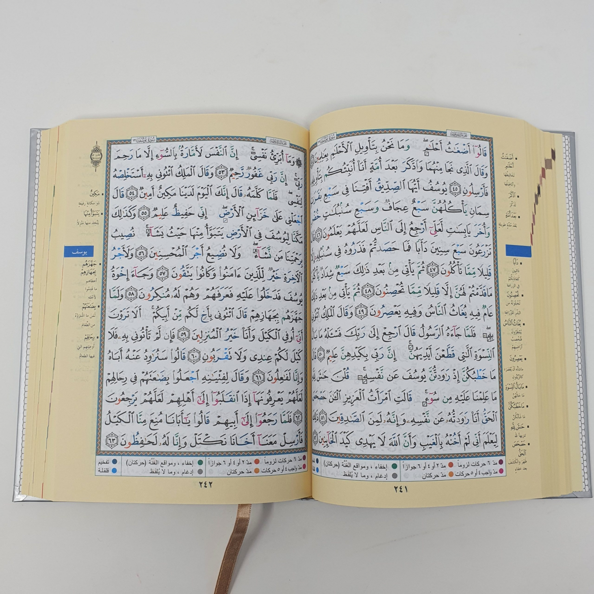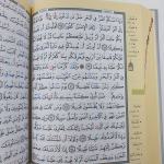 Deze Quran (hafs) bevat Tajweed kenmerken om de juiste uitspraak te reciteren. Deze kenmerken zijn aangegeven met kleuren om zo de correcte recitatie van de heilige Quran te vergemakkelijken. Op gegeven moment zal je gewend raken aan de juiste manier van reciteren waardoor je de kenmerken niet meer nodig zult hebben.