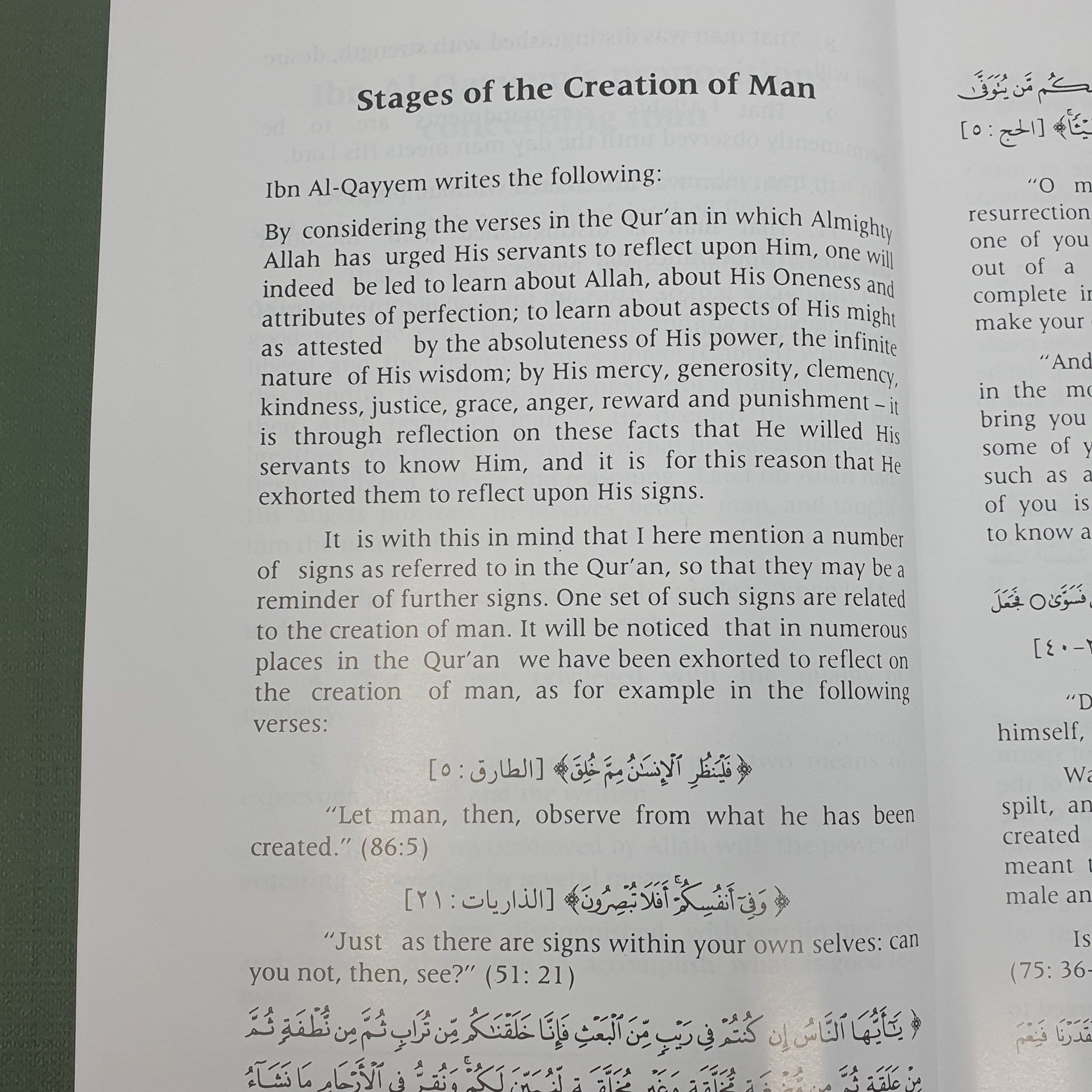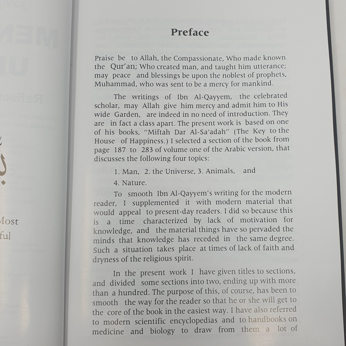 This book was originally a section of ibn Al-Qayyem’s book Miftaahas Daar is-Sa’aadah (Key to the Abode of Happiness).This section was extracted from it due to its discussion of some of the Signs of Allah in the human beings and the universe. Also, Ibn Al-Qayyem’s book was chosen due to its perceptive and meaningful wisdom. Another outstanding characteristic of this book is that Ibn-Al-Qayyem calls for the use of the intellect and self-introspection. He encourages the reader to deeply think about the creation of Allah, the Most High-in the human being, existence, animals and nature.The compiler, Capt. Anas Abdul-Hameed AI-Qoz, supports the writing of Ibn AI-Qayyem by mentioning modern scientific discoveries, useful notes and beneficial pictures that help to achieve the objective. Thus, this book is a continuous and active call to mankind to look and reflect upon the Signs of Allah if they want the truth and sincerely wish to follow itWe will show them Our Signs in the universe and In themselves until it becomes clear to them that it is the truth
