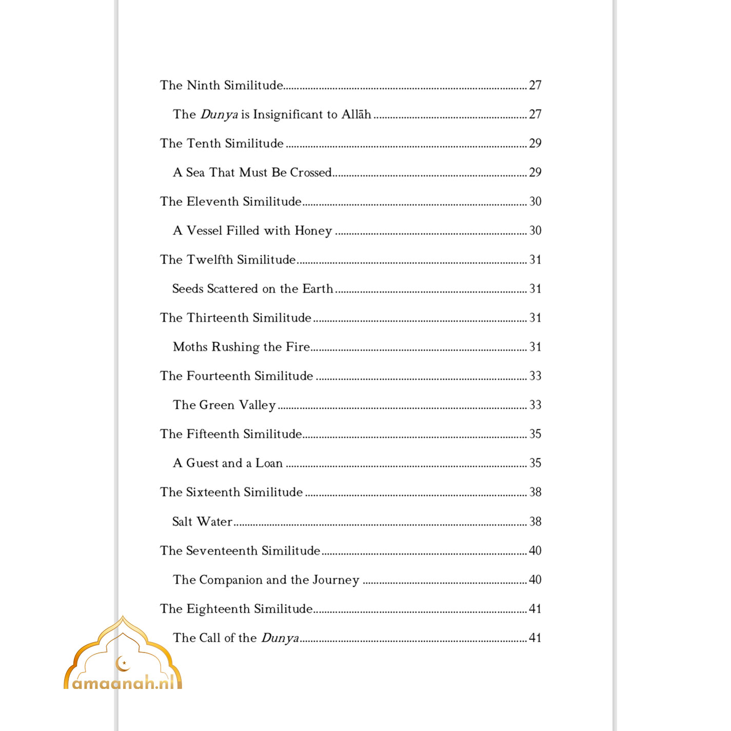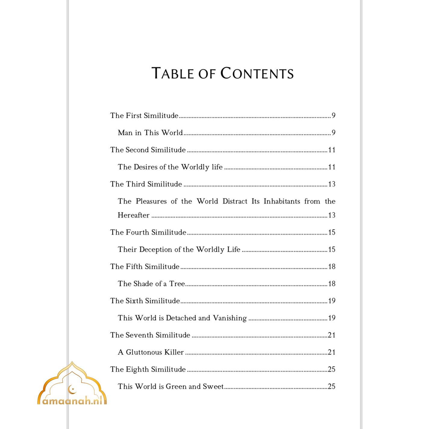 The similitude of this world is like that of a vessel filled with honey. The flies see this vessel and fly toward it. Some of them sit on the edge of the vessel and take from the honey until they satisfy their needs, and then they fly away. Some of them are led by their greed to plunge themselves into the abyss of the honey. Their submersion into the honey prevents them from enjoying it, except for a brief enjoyment, until they perish in the middle of it.