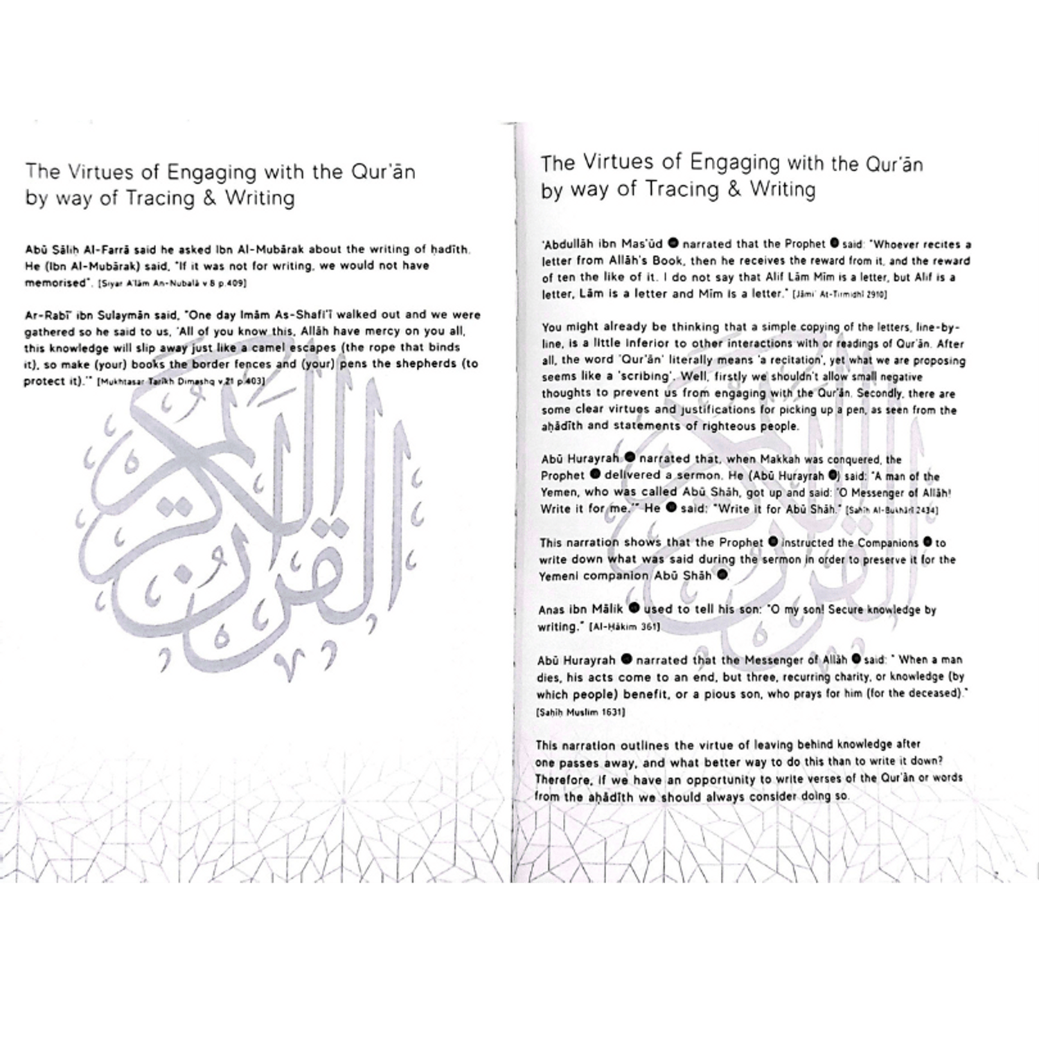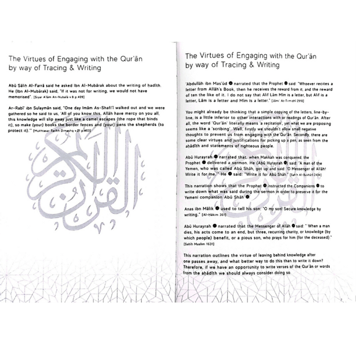 Through tracing the verses, they will gain the tools to appreciate the Qur’an and its teachings in a lasting personal way. In a detailed yet simple manner, the enthusiast will also gain an understanding of the Qur’an as they trace; Ibn Daud Books have included a comprehensive translation alongside a word-for-word translation.