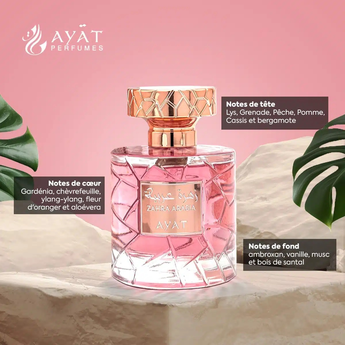The heart of Zahra Arabia reveals floral richness with accords of gardenia, honeysuckle, ylang-ylang, orange blossom and aloe vera. Gardenia and honeysuckle offer elegant floral sweetness, while ylang-ylang and orange blossom add exotic, captivating opulence. Aloe vera completes this harmony with a green and hydrating note, creating an aura of serenity and well-being.